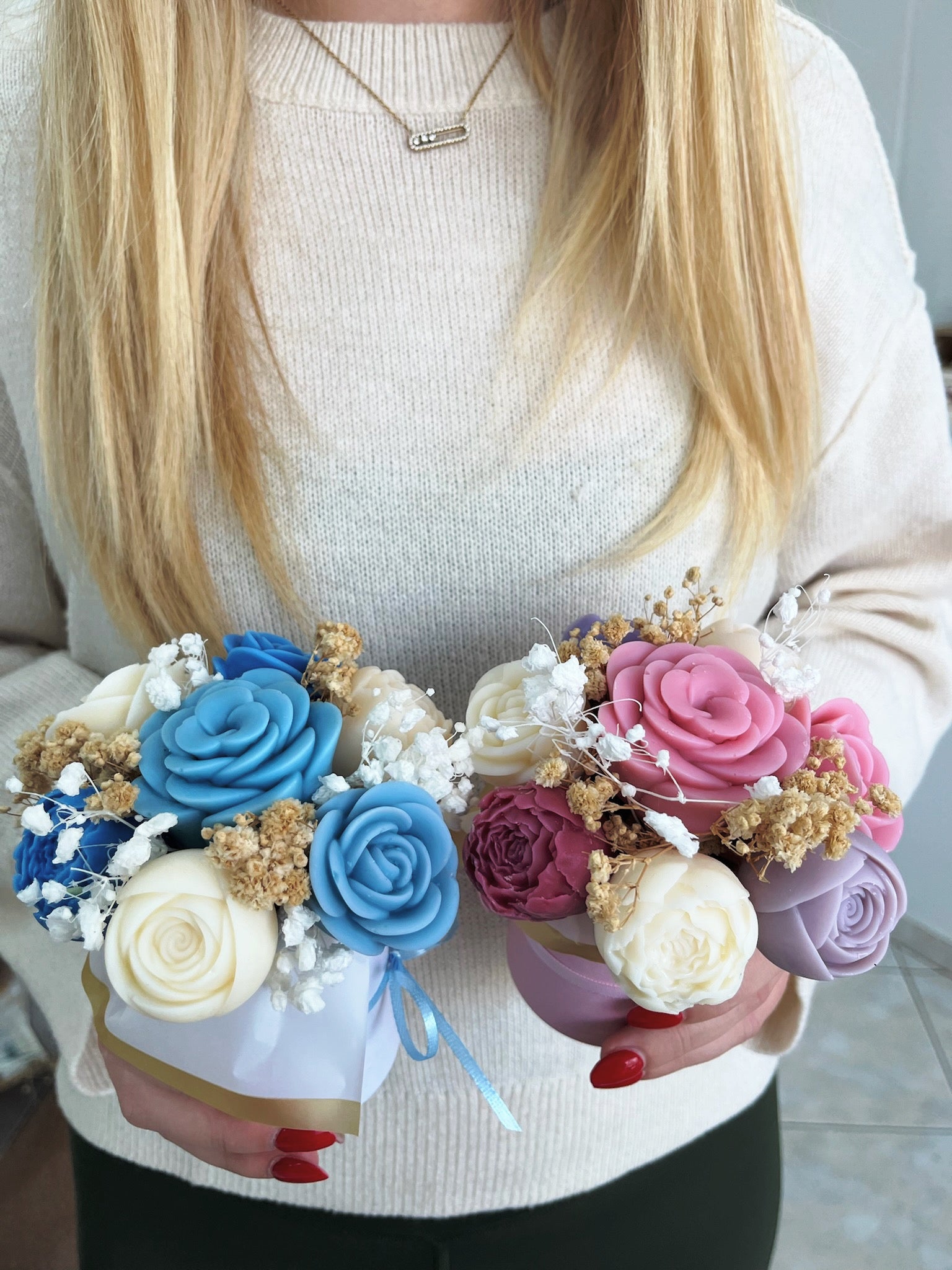 Elegant and refreshing, the Blue Rose Candle Bouquet is a handcrafted arrangement designed to resemble a delicate flower bouquet while doubling as a unique candle display. Featuring beautifully detailed rose and peony-style candles in soft blue and creamy ivory tones, this bouquet brings a calming and sophisticated touch to any space.