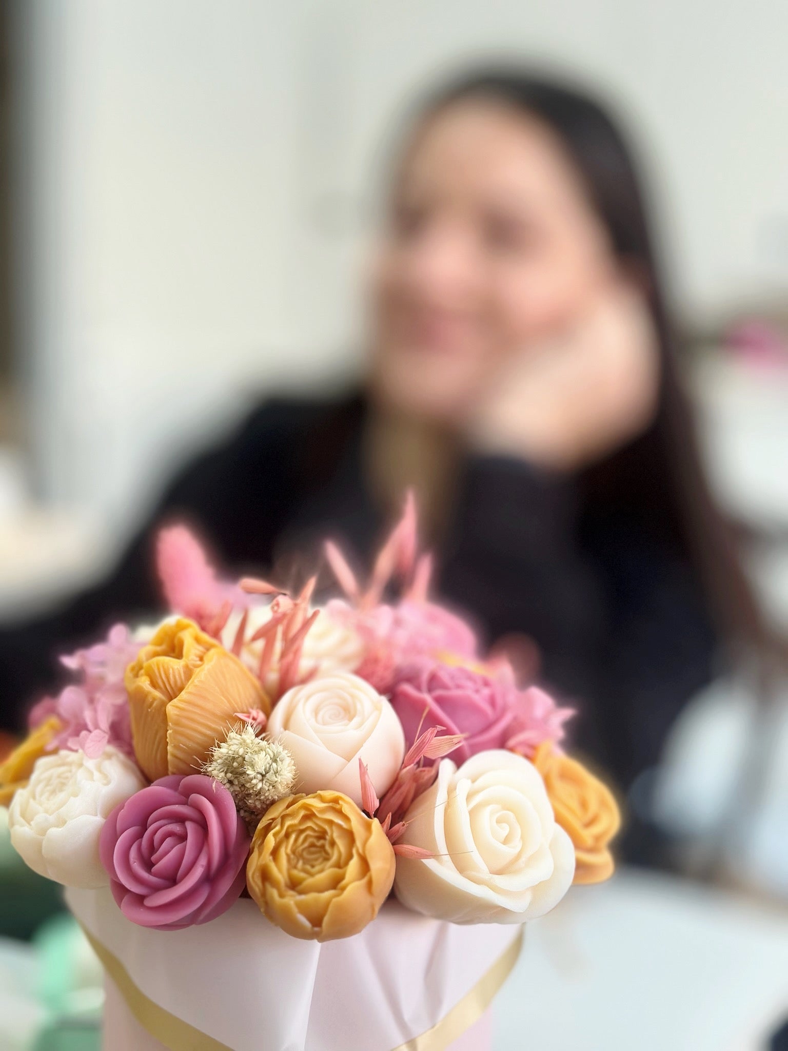 Bright, elegant, and full of charm, our Pink & Orange Floral Bouquet Box features a stunning arrangement of handcrafted rose-style blooms in warm orange, soft blush pink, and creamy ivory tones. Carefully arranged in a stylish pastel hat box and finished with a delicate satin ribbon, this bouquet creates a beautiful balance of vibrant warmth and soft romance.