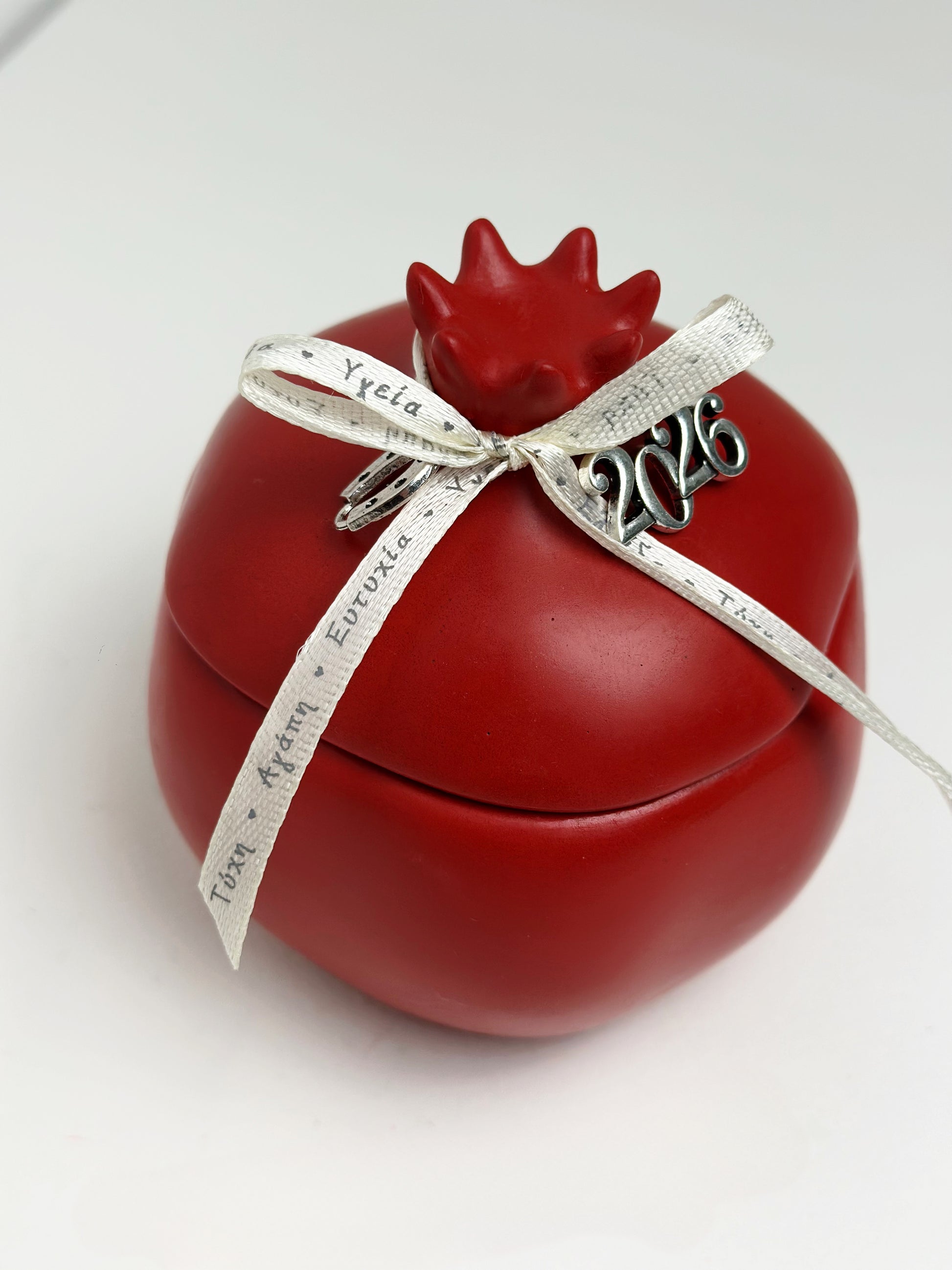 Celebrate the New Year with our Red Pomegranate Lucky Charm Scented Candle 2026, a beautifully handcrafted symbol of prosperity, abundance, and good fortune. Inspired by the Greek tradition of gifting pomegranates for luck, this unique candle brings a warm festive glow to your home while filling your space with your chosen seasonal scent.